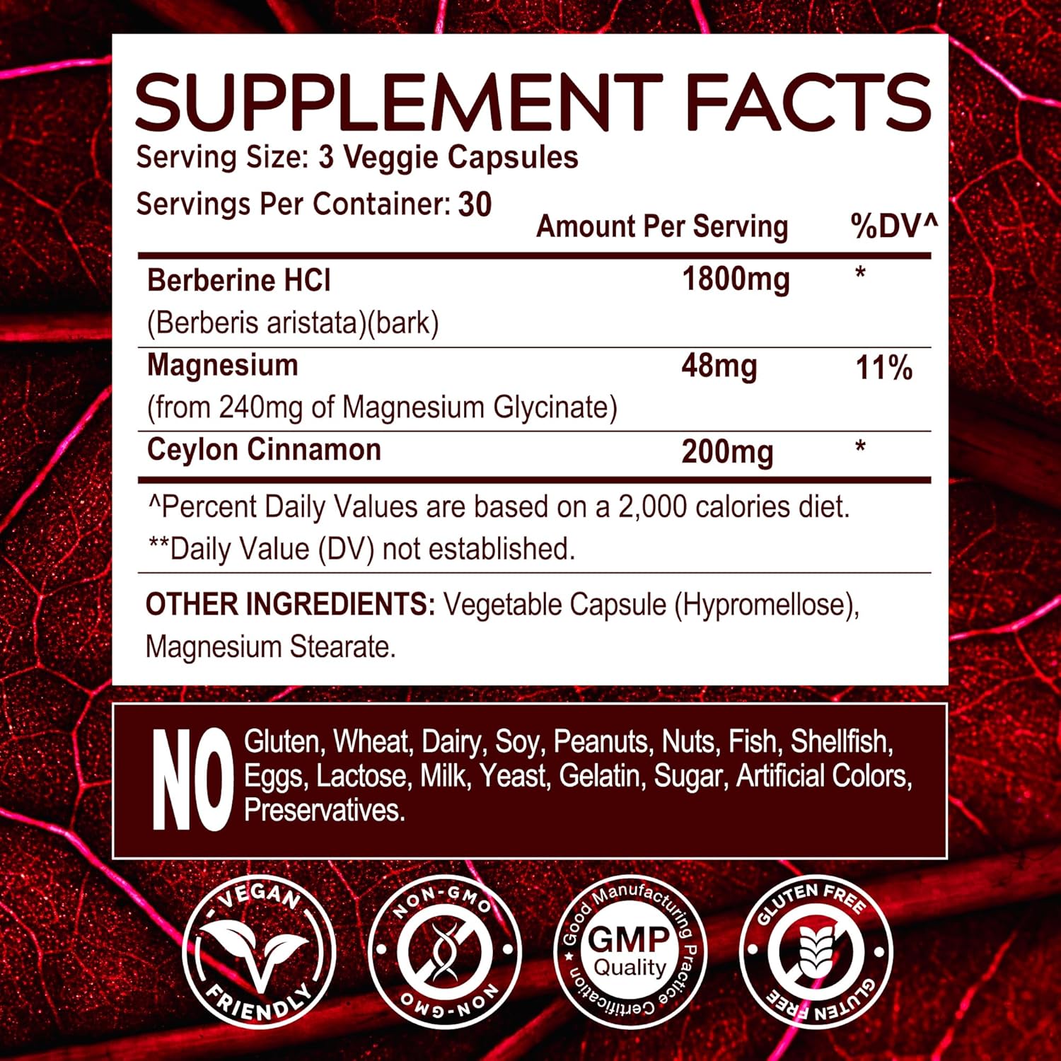 - A Vegan, Gluten-Free, Dairy-Free, and Non-GMO Source of Extra Berberine: Sustain your balanced health with a potent trio of Berberine, Magnesium, and Ceylon Cinnamon–all packed in 90 vegan capsules free from gluten, dairy, and GMOs for easy daily consumption.