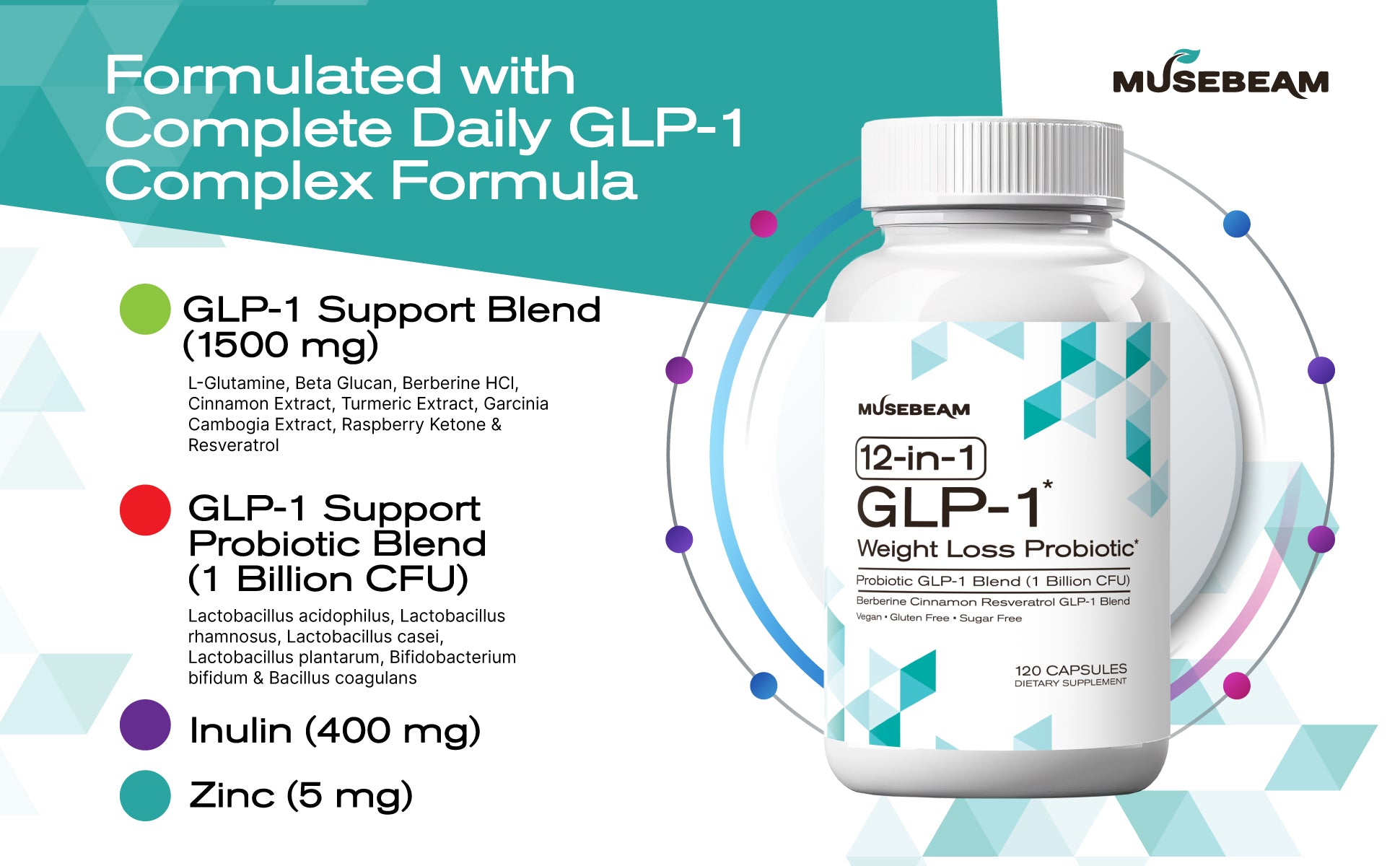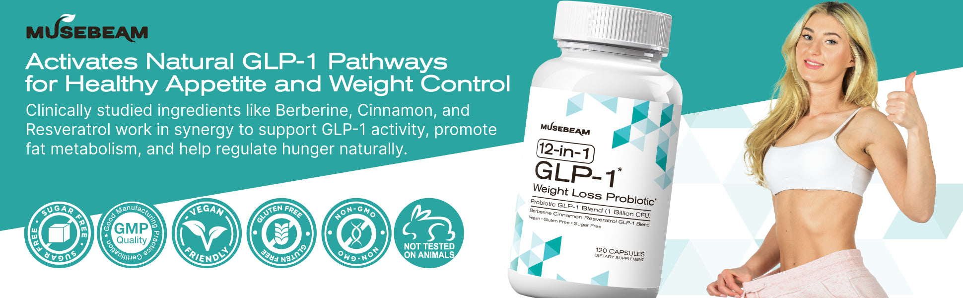 - 12-in-1 Weight Management Formula: MuseBeam 12-in-1 GLP-1 Weight Loss Probiotic Capsules deliver a robust 1500 mg blend including Berberine, Cinnamon, Turmeric, Resveratrol, Garcinia, Raspberry Ketone, and more to support healthy GLP-1 activity, fat metabolism and appetite regulation. This carefully crafted formula complements active lifestyles by promoting balanced eating patterns, supporting natural weight goals, and encouraging gut and metabolic health.