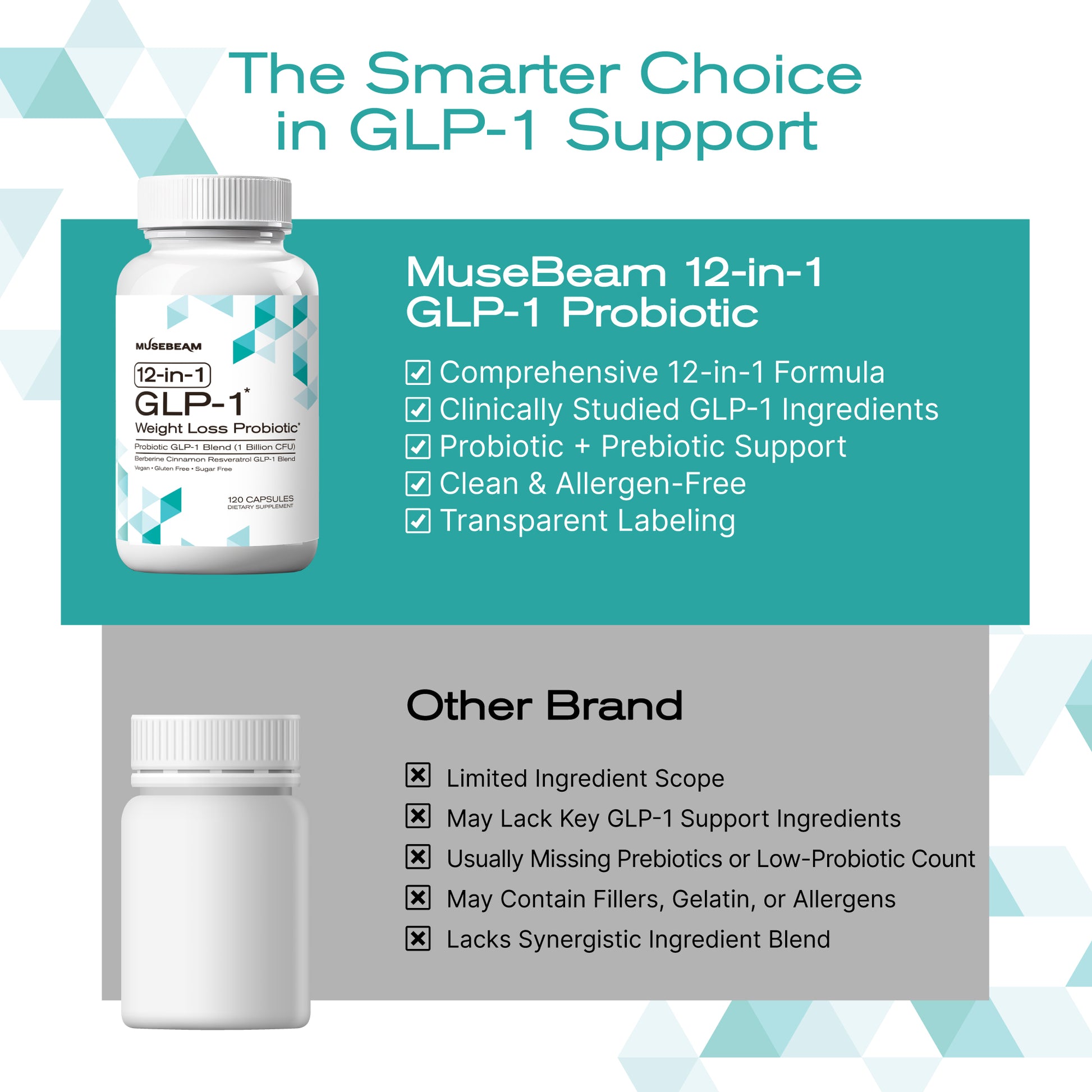 - Clean, Vegan & Allergen-Free Formula: MuseBeam 12-in-1 GLP-1 Weight Loss Probiotic is crafted with care to be free from gluten, sugar, dairy, soy, preservatives, and artificial additives. Made in a GMP-certified facility using non-GMO ingredients, this oral formula delivers pure, transparent supplementation without proprietary blends, providing consistent, quality support in every capsule for a clean daily routine.